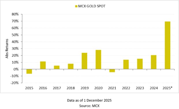 In the year 2025, gold has clocked 69.3% absolute returns so far (as of 1 December 2025). This is the highest annual return by the precious yellow metal in the last decade. In fact, the returns are even higher than what we witnessed in 2019 and 2020, the years when the COVID-19 pandemic gripped the world.