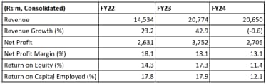 The company maintained strong financial health, with an average RoE of 14.3% and RoCE of 15.9%.
