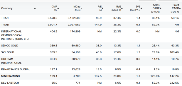 Snapshot of the Top Lab Grown Diamond Stocks on Equitymaster’s Stock Screener