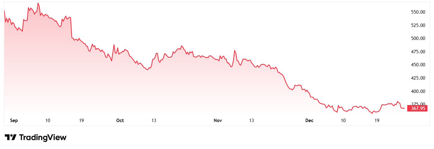 The share price of Mangal Electrical Industries Ltd, at listing in August 2025, was around Rs 535, and as of closing on 29th December 2025, it was Rs 368.