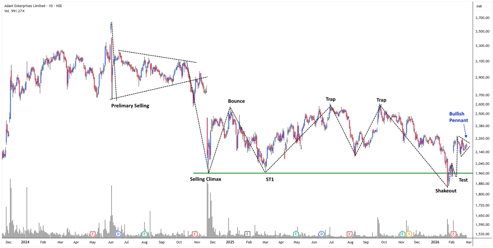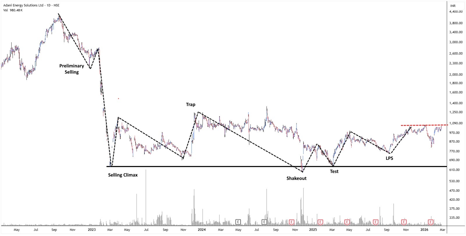 Adani Energy Solutions and Adani Enterprises have the same technical structure. The stock seems to be building a base that fits with Wyckoff’s accumulation principles after a long correction.