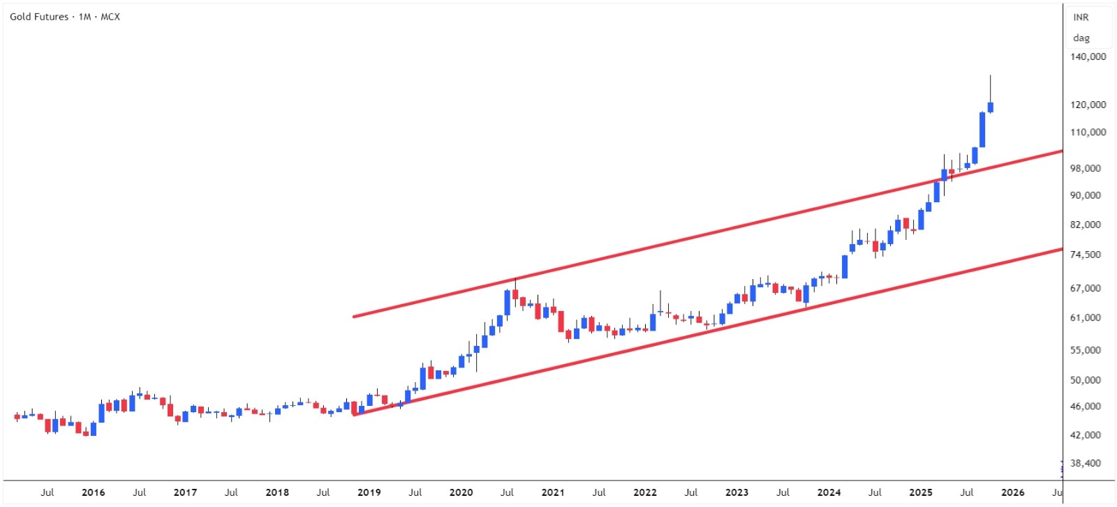 Indian Gold prices usually track global COMEX trends, with the added influence of currency. Over the years, Gold on MCX (Multi-Commodity Exchange) has respected the rising channel beautifully. But the fireworks came when prices finally crossed the Rs. 1,00,000 per 10 gm mark, a level that carried both technical and emotional weight.