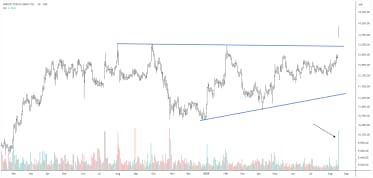 On the daily chart, it broke out from a symmetrical triangle pattern, a long-term consolidation structure that had held the stock in a tight range for 382 days.