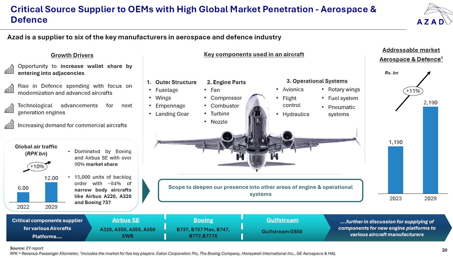 The segment delivered standout growth of 84% year-on-year in FY25 and is expected to grow significantly in FY26. Growth drivers include the increasing demand for commercial aircraft (driven mainly by Boeing and Airbus), fleet modernisation programs, and heightened defence spending globally. Azad aims to increase its wallet share by entering into related segments.