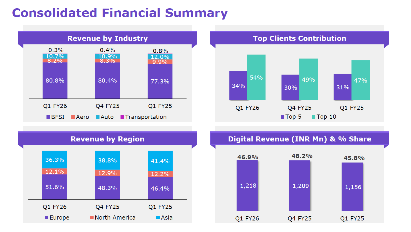 From a financial perspective, revenue grew 3% year-over-year to ₹2.6 billion. The BFSI sector contributed 80.8% of the revenue, followed by the auto sector (10.7%), the aero sector (8.2%), and others. Europe contributed 51.6% of revenue, followed by North America (12.1%) and Asia (36.3%).