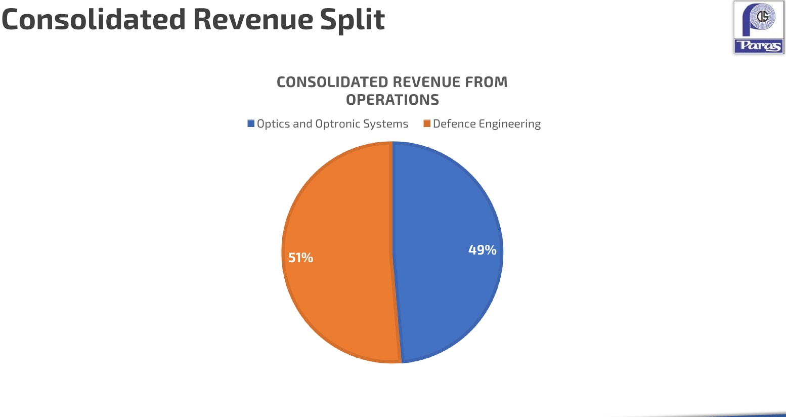 Paras Defence manufactures integrated electronic systems for aircraft and provides optical and mechanical components crucial for airborne navigation and surveillance. Its services are segregated into two core verticals: Optics and Optronic Systems and Defence Engineering. The former accounted for 49% of revenue in FY25, and the latter contributed 51%.