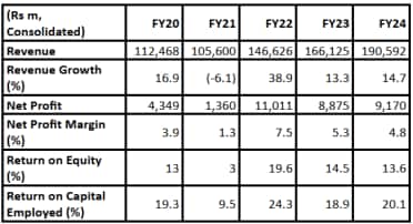 In FY25, the net profit rose 61% YoY to Rs 14.5 bn and revenue grew 14% YoY to Rs 217.9 bn.