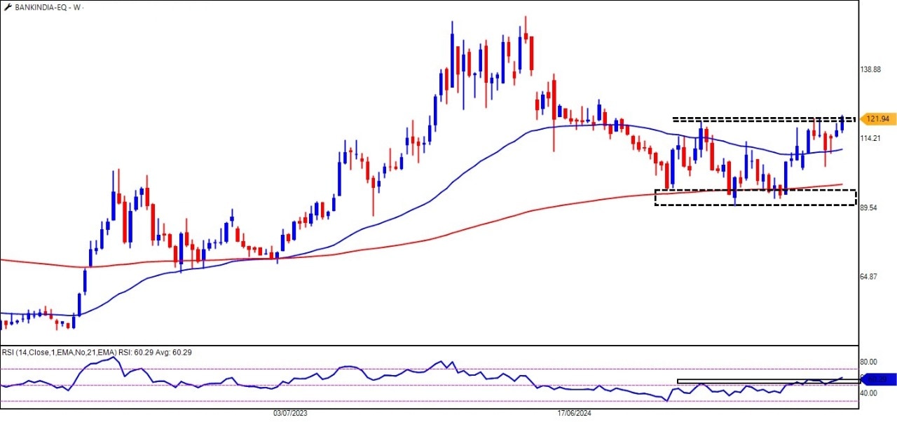 On the weekly chart, Bank of India has formed a solid base around the 200-Week Exponential Moving Average (200WEMA) and is now poised for a potential breakout. The stock is currently trading near a crucial resistance zone, and a close above the 125-mark could open up a new range for further gains.