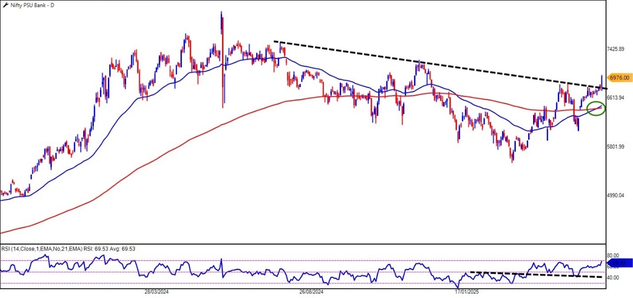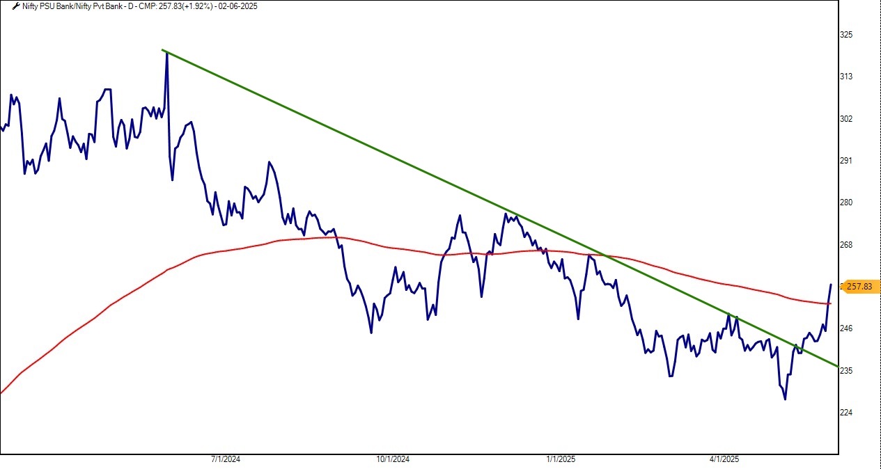 Looking at the ratio chart of Nifty PSU Bank versus Nifty Private Bank (PVT Bank), a clear outperformance trend is emerging. The slope of the ratio has turned northwards, meaning the PSU banks are starting to outperform their private counterparts. As the ratio moves above its 200-Day Exponential Moving Average (200DEMA), the probability of continued outperformance for PSU banks increases, further boosting the positive sentiment surrounding this sector.