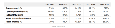Between 2020-2024, the sales and net profit have reported a CAGR of 6.4% and 24.6%, respectively. The company’s average RoE and RoCE stand at 4.6% and 5.7%, respectively.