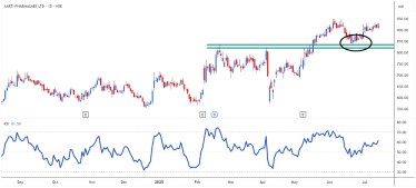 On the daily chart, the stock price of Aarti Pharmalabs broke out above its previous all-time high of Rs 837 in May 2025, hitting a new high of Rs 949. Retracing to Rs 838 to retest the breakout zone, the stock has resumed its northwards journey and is convincingly trading above Rs 900.