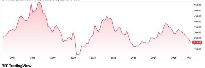 At the current price of Rs 213, the stock is trading at 65% discount from its all-time high of Rs 616 and a discount of 44% from its 52-week high of Rs 380.