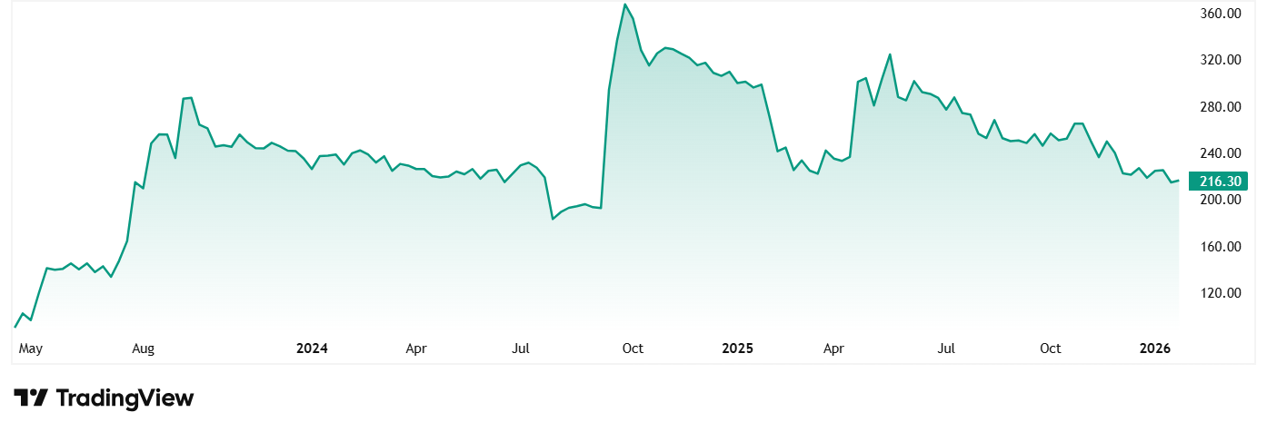 At the current price of Rs 209, the stock is trading at a discount of 37% from its all-time high of Rs 330.
