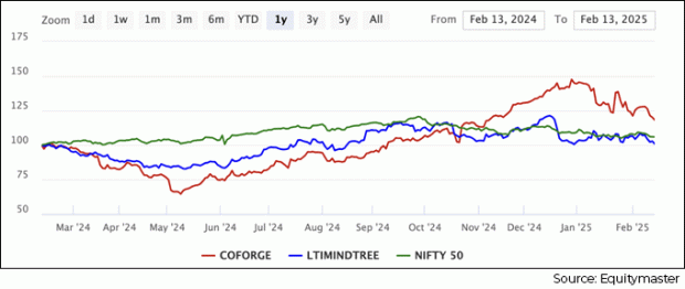 In terms of stock market performance, Coforge is leading with an 18% return, followed by LTI Mindtree with a 1% return.