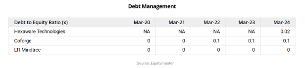 LTI Mindtree is a debt-free company, whereas Coforge and Hexaware Technologies have very low debt on their books.