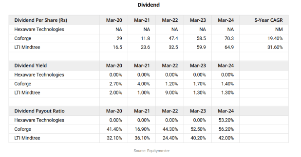 In the last five years, Coforge and LTI Mindtree increased their dividend per share by a CAGR of 19.4% and 31.6%, respectively.
