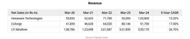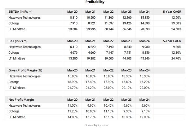 The EBITDA of Hexaware Technologies, Coforge, and LTI Mindtree have grown at a CAGR of 12.5%, 13.5%, and 24.6% respectively. Their EBITDA margin averaged at 15.4%, 17.4%, and 21.8% respectively in the last five years.