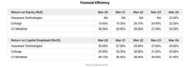 The five-year average RoE for Hexaware Technologies, Coforge, and LTI Mindtree is 22.6%, 22.8%, and 26.8%, respectively, whereas the five-year average RoCE is 27.8%, 28.5%, and 36.6%, respectively.