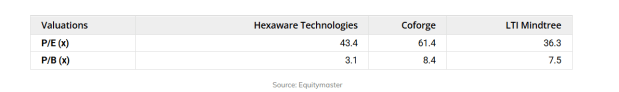 Hexaware Technologies PE and PB are 43.4 and 3.1 respectively. Although the shares of the company are not listed yet, they are undervalued when compared to its peers.