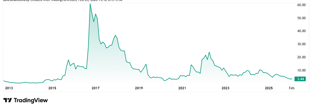 The stock is trading at a PE of 8x, while the current industry median is 10x. Which could mean the market is discounting the stock because its earnings are “on paper” only, trapped in a long collection cycle rather than being realized as cash. Investors view its low PE not as a bargain, but as a necessary risk premium to compensate for high debt and the potential threat of insolvency.