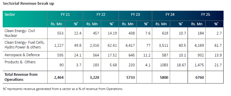 The aerospace and defence sector is a significant and growing segment for MTAR Technologies. It supplies precision-engineered assemblies and components for domestic defence programs and other applications. Clean Energy is the largest business segment, accounting for 64.4.8% of FY25 revenue, followed by Products and Others (21.8%) and Aerospace and Defence (13.8%).