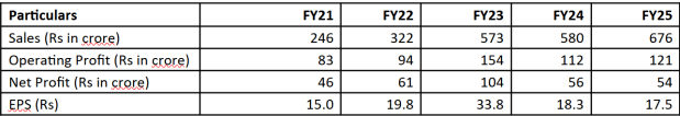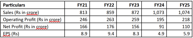 In FY25, revenue was flat at Rs 1,074 crore, but PAT rose 21% to Rs 110 crore. EBITDA grew 11% to Rs 249 crore, but margins declined to 23% from 30% in FY24. Management noted better working capital control and an Rs 8.5 crore reduction in inventory, helping improve cash flow and reduce debt.