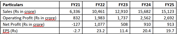 Bharat Forge’s revenue in the past five years increased by a CAGR of 13%, from Rs 6,336 crore in FY21 to Rs 15,123 crore in FY25. Net profit also increased from a loss of Rs 127 crore in FY21 to Rs 913 crore in FY25.