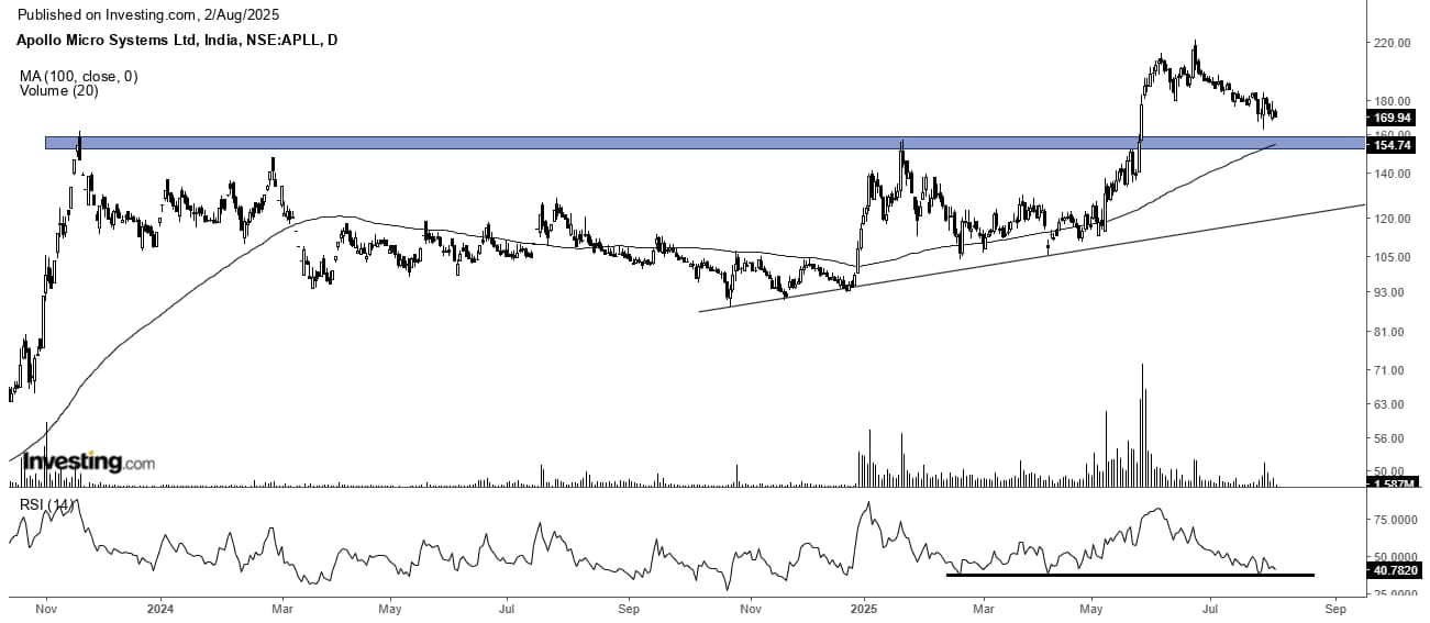 Apollo Micro Systems, which has been stuck in a sideways consolidation phase, saw a 45% decline between November 2023 – October 2024, falling from its all-time high of ₹162 to ₹88. But, the stock has recently crossed its previous all-time high, indicating the start of a fresh rally. It faced resistance around ₹220 and it is now trading above the ₹162 level, which is considered a key support point. Stock is also trading above the 100 day moving average, and RSI remains in a healthy zone, indicating strength.