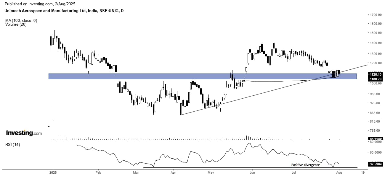 Unimech Aerospace made its debut at ₹1,460 but quickly entered a downward price channel, eventually falling by 44% between January & April (2025), from ₹1,523 to ₹850. But, since hitting the panic bottom, the stock has shown a strong recovery, surging by 64% from April to June 2025. At present, Unimech is displaying multiple bullish chart patterns. Stock is finding support along a rising trendline, & daily candles are holding above the 100 day moving average. RSI remains in the bullish zone, indicating the potential for sustained upward momentum.