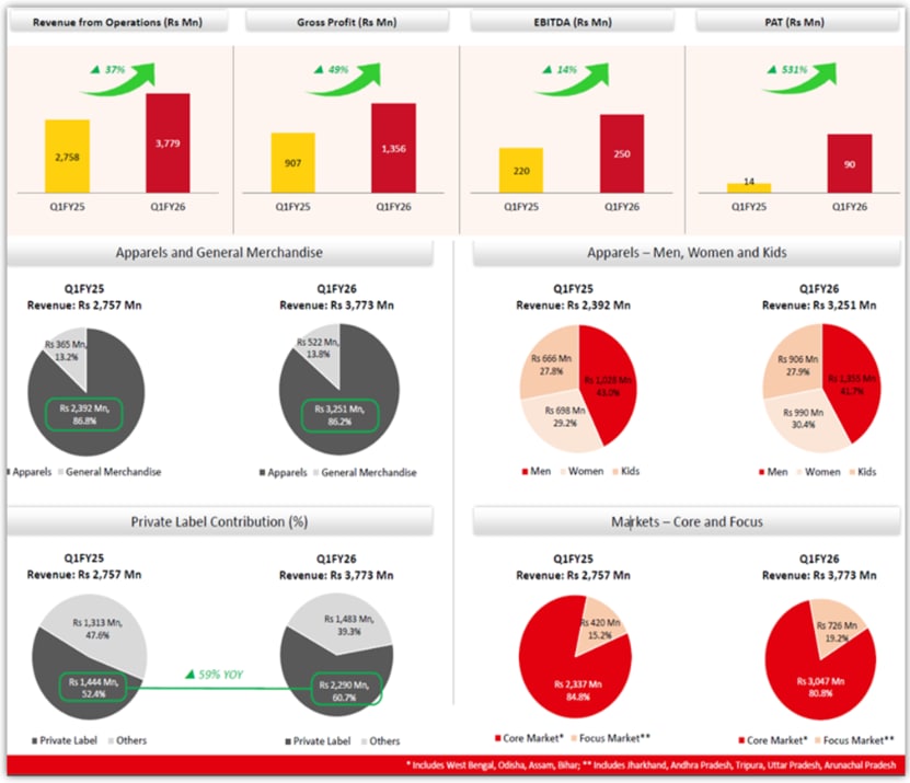 The company’s revenue in Q1FY26 increased by 37% year-on-year to ₹3.7 billion, driven by normalized same-store sales growth of 11%. Normalized here refers to the adjustment made, as the preponement of Eid shifted the benefit to Q4FY25. Apparel contributed 86.2% of revenue, with the remainder coming from general merchandise.