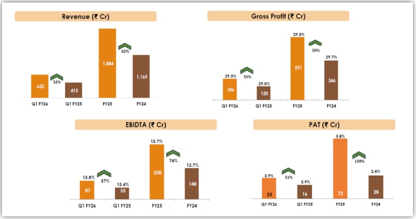 The company’s revenue in Q1FY26 increased 52% year-over-year to ₹6.3 billion, driven by 50% volume growth and 5% same-store sales growth. Its average selling price also increased 16.5% to ₹303, while average bill value increased 9.3% to ₹901.