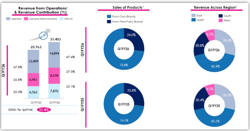 Vishal’s revenue rose 21% to Rs 31.4 billion in Q1FY26, led by an 11.4% increase in same-store sales. The apparel segment contributed 47.4%, followed by general merchandise (27.3%) and FMCG (25.1%).