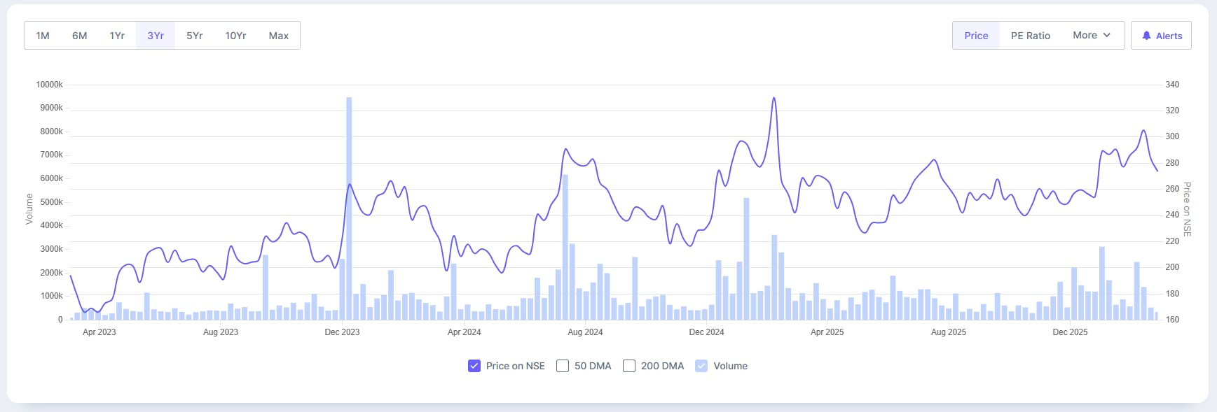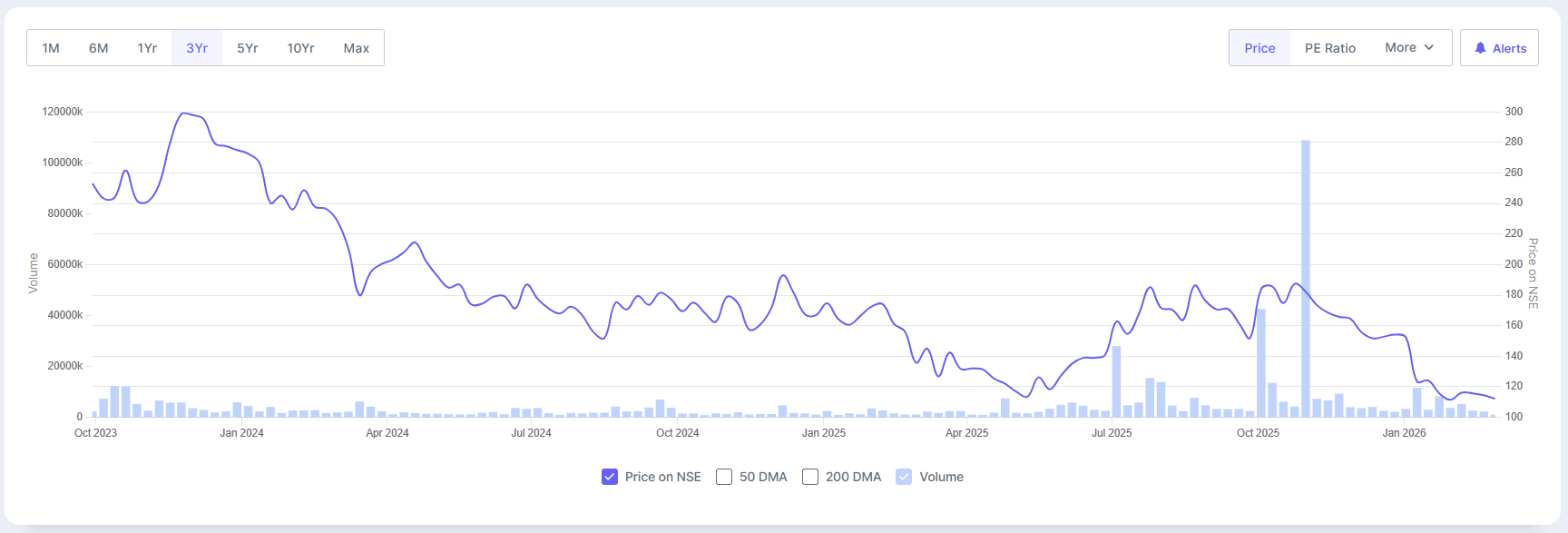 The average return on equity over the past three years was 13%. However, the stock price fell 23.8% during the same period (253 in Oct 23 to 112 in Feb 26).