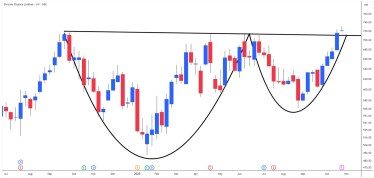 On the weekly chart of Shriram Finance, the stock is forming a Cup-and-Handle pattern, with a convincing 52-week high breakout.