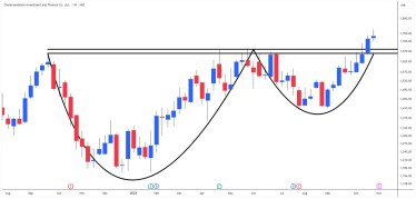 The weekly chart of CHOLAFIN shows a long-term bullish pattern called a Cup and Handle.