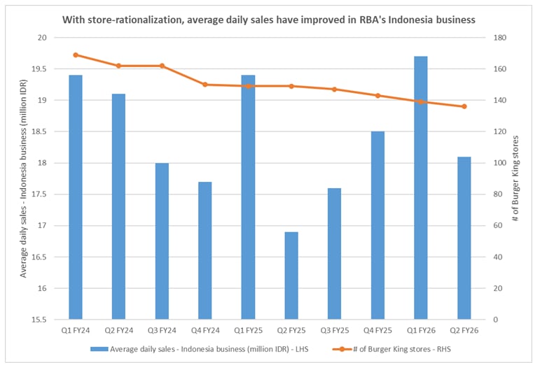RBA’s Indonesia business has been a persistent drag. Even in the latest reported quarter, higher promotional expenditure plunged the segment back into losses. Compared to Rs 0.20 crore restaurant operating margin (ROM) reported in Q1FY26, the Indonesia business reported an ROM loss of Rs 6.3 crore in Q2FY26. Of course, thanks to rationalization of stores in the region, average daily sales (ADS) has picked up pace in recent quarters.