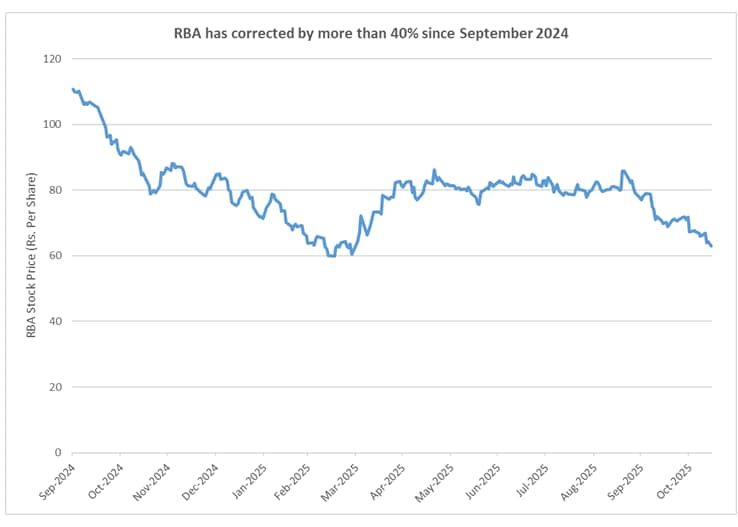 After meandering around its listing price for years, RBA’s stock has corrected by more than 40% since September 2024. Sure, growth has slowed down over the years, on a rising base – year-on-year revenue-growth has mellowed from 45.7% in FY21 to 5.1% in FY25.