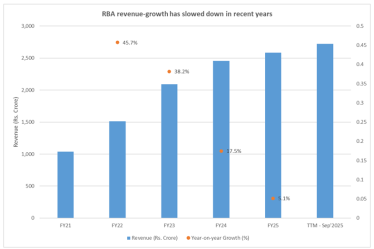 After meandering around its listing price for years, RBA’s stock has corrected by more than 40% since September 2024. Sure, growth has slowed down over the years, on a rising base – year-on-year revenue-growth has mellowed from 45.7% in FY21 to 5.1% in FY25.