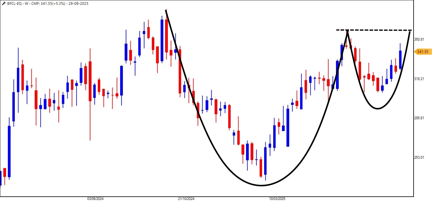Rounding out our trio is BPCL, as the charts mirror its peers. The Cup & Handle pattern is visible on the chart, indicating the end of the consolidation zone and the beginning of the new trend as soon as it breaks from the handle placed at Rs. 360.