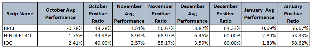 Seasonality analysis indicates that the Indian Oil Corporation Ltd (IOC), Bharat Petroleum Ltd (BPCL), and Hindustan Petroleum Ltd (HPCL) have experienced negative returns between 0.78% and 2.4% in October. But this dip could be the accumulation period for the investors. The period from November to January yields handsome returns, ranging from 8% to a whopping 18%, with HPCL leading the table.