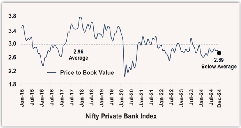 Relatively, it is trading at par with HDFC Bank, which has a PB of 2.9, and at a nearly 10% discount to ICICI Bank, which has a PB of 3.3.