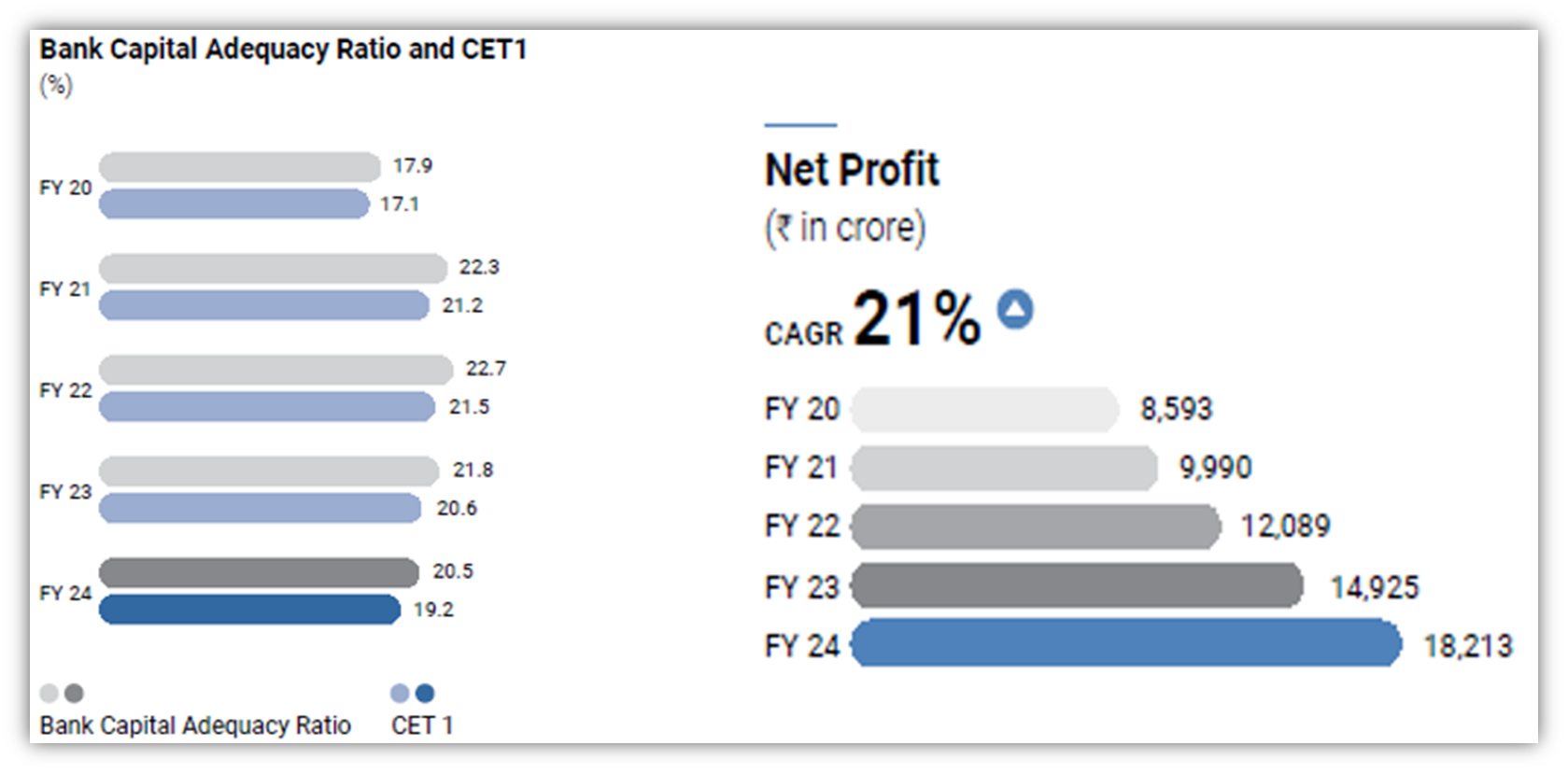 The bank’s net profit has grown at a strong 21% CAGR in the last 5 years to ₹182 billion in FY24, driven by healthy loan book expansion, strong growth in NII post, stable asset quality, and improving operating efficiencies.