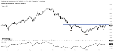 - Berger Paints displays an inverted head and shoulders pattern, with RSI entering the bullish zone, signaling a possible trend shift.