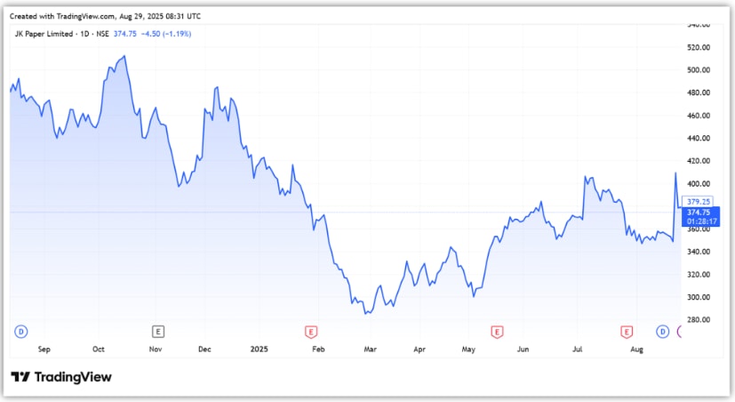 The market has already taken note, resulting in a 31% increase in JK Paper shares over the last six months to ₹378. JK also pays a dividend every year, with a dividend of ₹5 per share already announced in Q1 of FY26. This translates to a dividend yield of 1.3% as of FY26 to date.