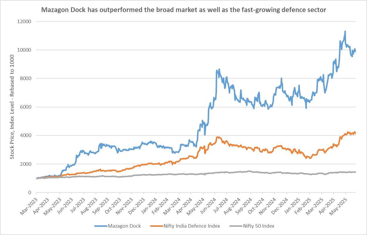 Mazagon’s fast-expanding order-book and strong execution track-record have drawn in investors in hordes. But it is not just retail investor optimism (obsession?) with the defence sector that has supported the stock’s rise.