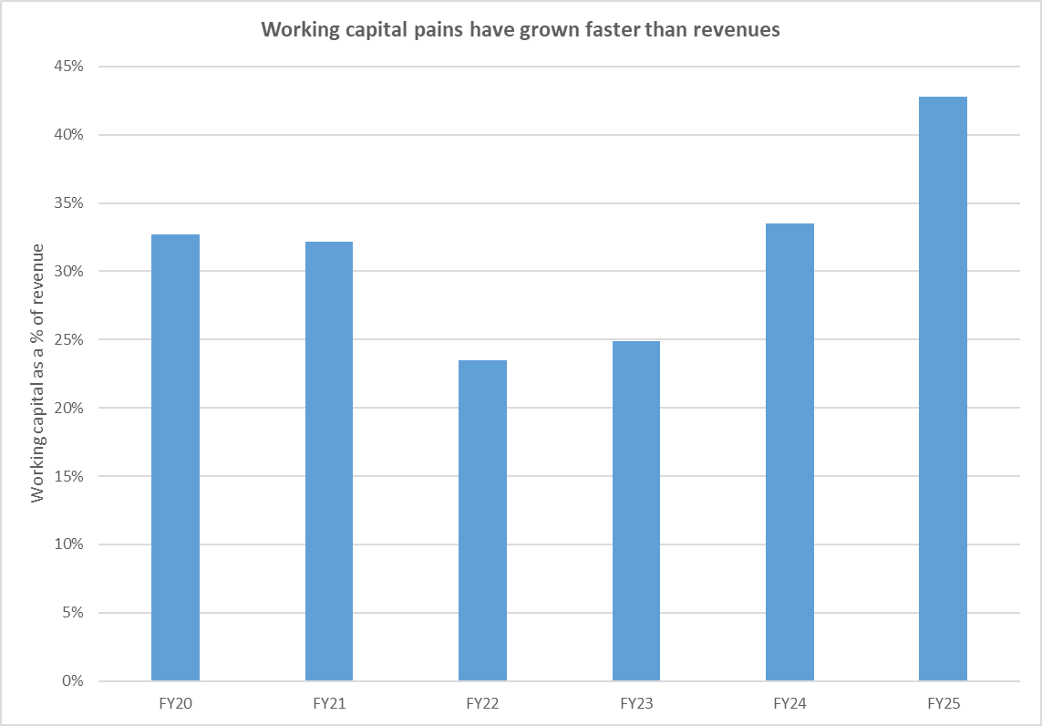Furthermore, as is typical with companies catering to government projects, receivables have remained under stress. In fact, working capital requirements have spiked from 33.5% of revenues in FY24 to 42.8% in FY25. As margins moderate and working capital pressures escalate, cash-flow management could get trickier.