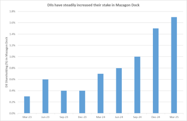 Domestic institutional investors (DIIs) have steadily increased their stake in Mazagon Dock. The government holds almost 85% stake in the company, and DIIs have increased their shareholding from just 0.3% in March 2023 to 1.7% in March 2025. The rising conviction of DIIs in the defence stock speaks to its long-term potential.