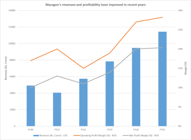 Mazagon recognizes revenues on a milestone-basis. When the execution on an order reaches predefined milestones, proportionate revenues are recognized. So, in the early phases of an order’s execution, when the focus is on finalization of design and other specifications, costs run ahead of revenues. This results in subdued margins.