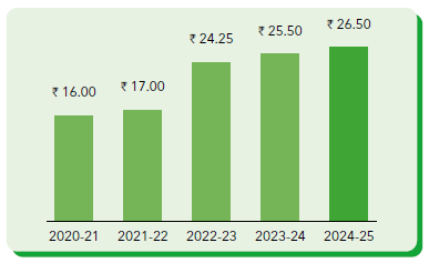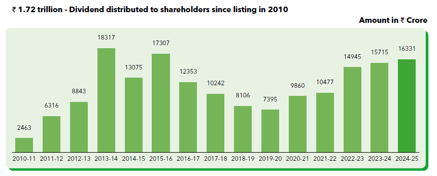 Historically, Coal India has paid a higher dividend each year during the last five financial years. It paid a dividend of ₹26.50 in FY25, translating into a dividend yield of 6% as per the current price of ₹440 per share.