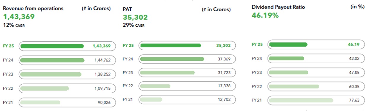 Over the last 3/5/10 years, net profit has grown at 27%/16%/10% CAGR. Revenue was almost flat at ₹143,369 crore in FY25, due to a drop in average selling price. EBITDA (Earnings Before Interest, Tax, Depreciation and Amortisation) decreased 0.3% to 51,640 crore, with a 36% margin. Net profit declined by 5.5% to ₹35,302 crore, but was 94.5% of last year’s profit (₹37,369 crore).
